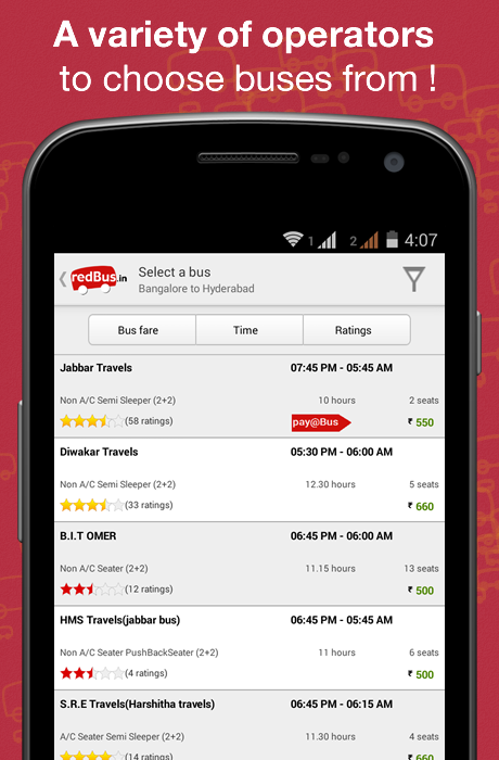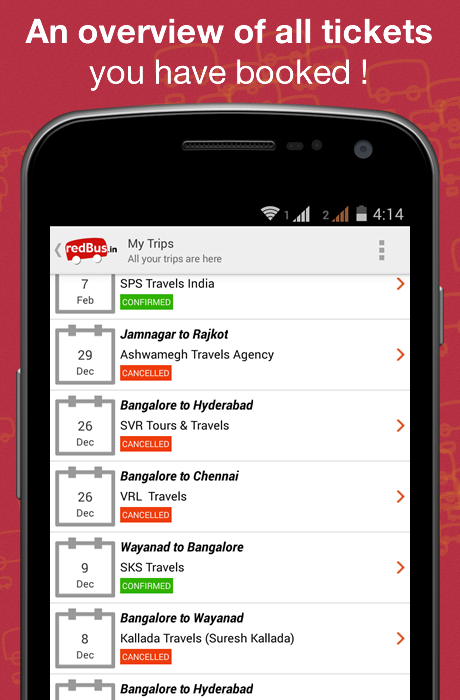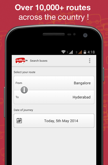 India's highest rated BUS booking appThe fastest and trusted way of booking BUS & Volvo tickets online is now available on Android. The official Android app from redBus.in lets you search and book more than 10,000 routes including buses like KSRTC, VRL, SRS, KPN, Orange Tours, Neeta, Kallada, Kesineni, SVR, Sharma Travels, HKB and many more.