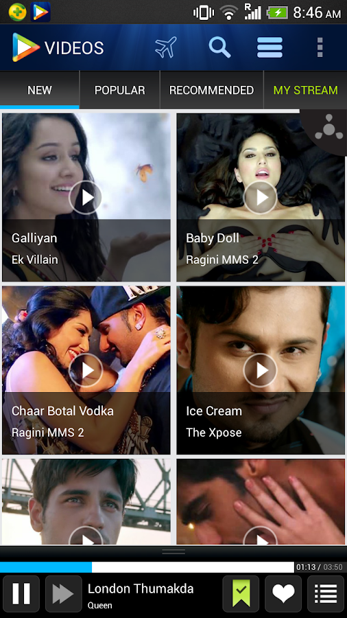 So enjoy free streaming and Unlimited downloads of Music and Videos from our vast collection. Tune in to music from our collection of 500+ playlists created by our Music experts or sweep across Celeb Radio, Festivals, Party, Retro, etc. For those who like to just sit back and ease out to music, we've got Live Radio stations to choose from. Also be updated and enjoy songs from the latest Bollywood movies such as Fugly, 2 States, Ek Villain, Heropanti, Bhoothnath Returns, Youngistaan & Songs such as Fugly Fugly Kya Hai, Galliyan, Suno Na Sangemarmar, Party with The Bhoothnath along with hits like Chennai Express, Yeh Jawani Hai Deewani, Aashiqui 2, Nautanki Saala, Lootera, Shuddh Desi Romance, Phata Poster Nikla Hero, Besharam, Krrish 3, Boss, Dhoom 3, Bullet raja, Yaariyan, Jai Ho, Shaadi Ke Side Effects, Gunday among many more and upcoming movies such as Ragini MMS 2, Bewakoofiyaan,Queen, Gulab Gang, Main tera Hero and current International chartbusters like Enrique’s I’m a freak & songs from Katty Perry, Lady Gaga & others. From the latest hits of Yo Yo Honey Singh such as Blue Eyes, Lungi Dance, ABCD, Sunny Sunny, Party All Night, Char Botal Vodka to Pritam’s Kabira, Badtameez Dil, Malang Malang its all here. Also enjoy Full Length Videos of your favourite songs including Baby Doll featuring hot & spicy Sunny Leone and Highway by Music Maestro AR Rahman. Always stay updated with songs from upcoming movies such as Bobby Jasoos, Hate Story 2, Kick, It's Entertainment, Singham Returns.